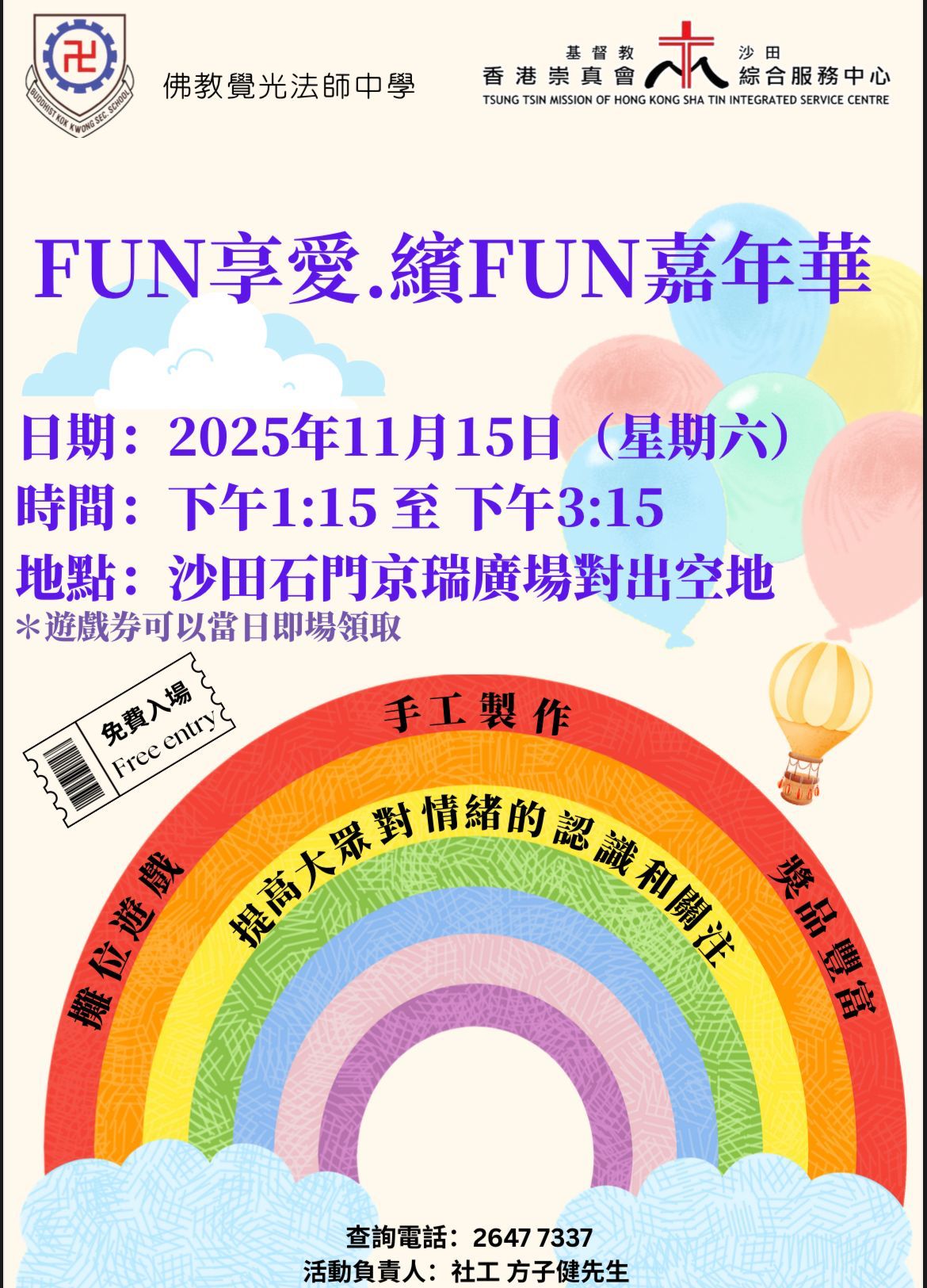 本校義工發展組老師聯同中五學生於2025年11月15日於沙田石門舉行嘉年華活動。